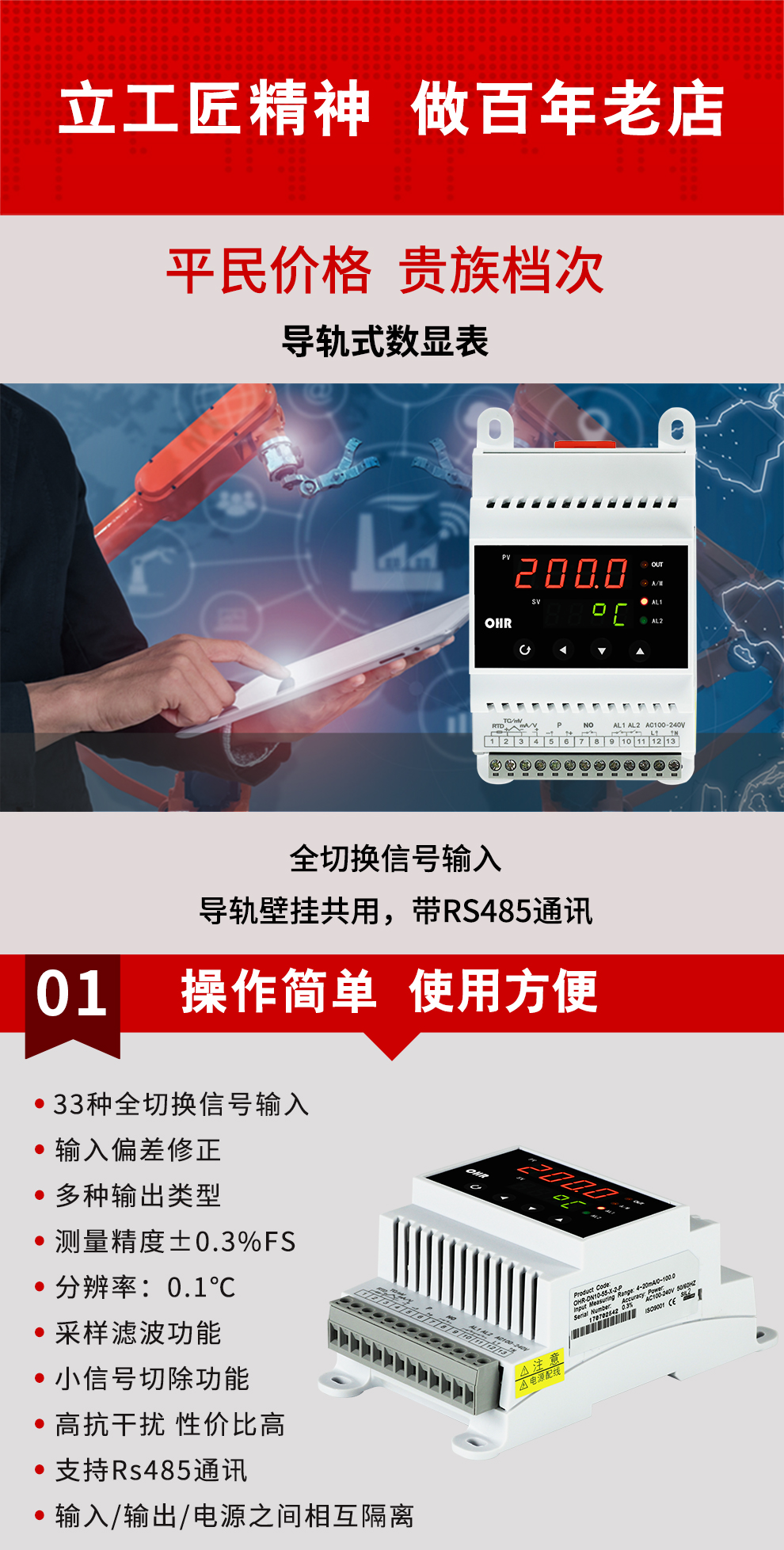 虹潤公司是專業(yè)生產(chǎn)數(shù)顯表的國家專精特新“小巨人”企業(yè),生產(chǎn)的導(dǎo)軌式數(shù)顯儀表,具有全切換信號輸入,導(dǎo)軌壁掛共用,全隔離設(shè)計,高抗干擾,變送輸出或RS485通訊等特點。產(chǎn)品獲得巡回檢測顯示方法及裝置、工業(yè)模塊的導(dǎo)軌式安裝結(jié)構(gòu)等2項國家發(fā)明專利,主持起草工業(yè)過程控制系統(tǒng)用模擬輸入兩位或多位輸出儀表、物聯(lián)網(wǎng)智能溫度儀表通用技術(shù)條件等2項國家標(biāo)準(zhǔn),,以及通信系統(tǒng)多通道數(shù)據(jù)采集控制終端規(guī)范軍用標(biāo)準(zhǔn),參與國際5G標(biāo)準(zhǔn)制定,取得簡易數(shù)顯儀表等3項相關(guān)軟件著作權(quán)。產(chǎn)品廣泛應(yīng)用于電力、石化、冶金、化工、造紙、食品、輕工、制藥、熱處理、水處理、機(jī)械配套等各種工業(yè)現(xiàn)場。