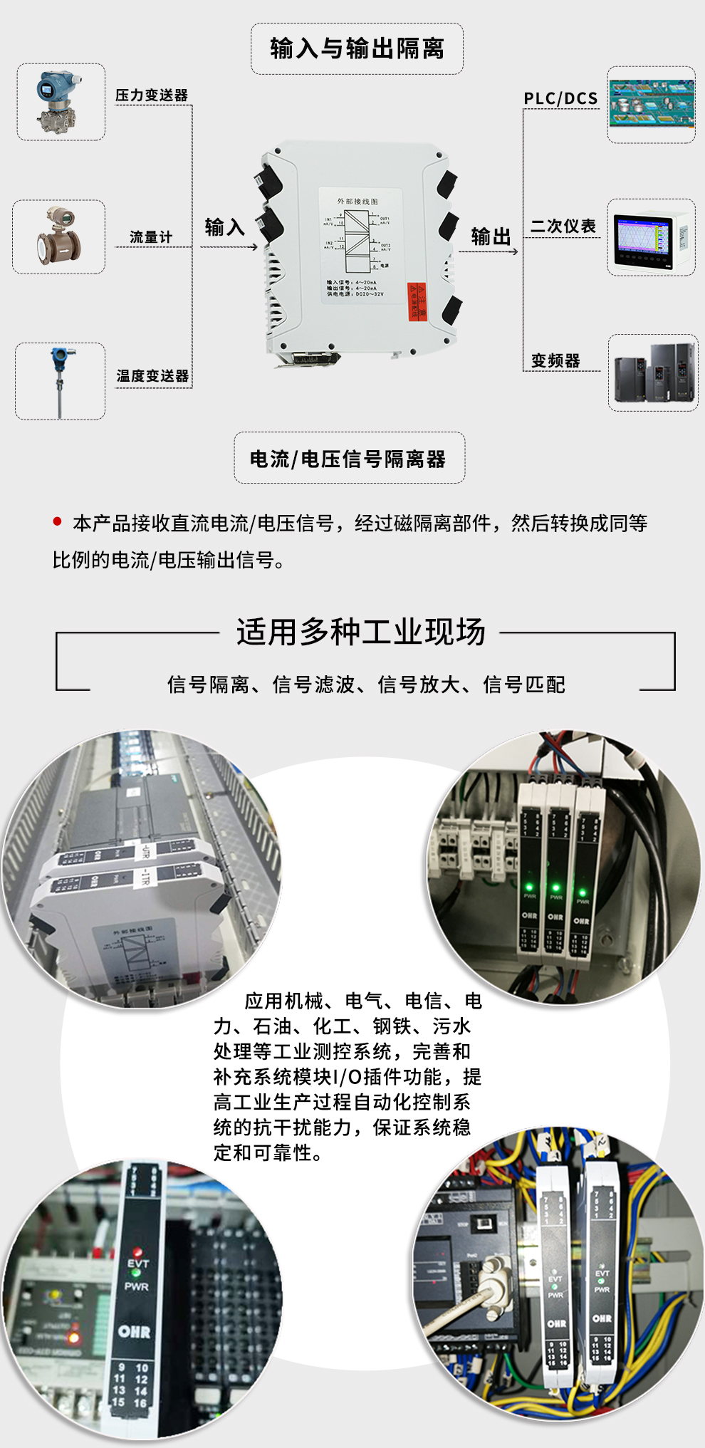 虹潤(rùn)公司是專業(yè)生產(chǎn)隔離器的國(guó)家專精特新“小巨人”企業(yè)。生產(chǎn)的信號(hào)隔離器,具有采用磁隔離技術(shù),直流電壓/電流輸入,響應(yīng)時(shí)間快,抗干擾能力強(qiáng),性價(jià)比高等特點(diǎn)。該產(chǎn)品不僅通過德國(guó)萊茵 CE 認(rèn)證與 SIL 功能安全認(rèn)證,還獲得信號(hào)隔離器、二端子模塊、無源信號(hào)隔離器等3項(xiàng)國(guó)家發(fā)明專利,主持起草現(xiàn)場(chǎng)設(shè)備工具(FDT)接口規(guī)范、工業(yè)過程測(cè)量和控制系統(tǒng)用隔離式安全柵、工業(yè)過程測(cè)量和控制系統(tǒng)用配電器等3項(xiàng)國(guó)家標(biāo)準(zhǔn),以及通信系統(tǒng)多通道數(shù)據(jù)采集控制終端規(guī)范軍用標(biāo)準(zhǔn),參與國(guó)際5G標(biāo)準(zhǔn)制定。產(chǎn)品廣泛應(yīng)用于石油、電力、化工,冶金、制藥、污水處理、窯爐控制等各種需要電隔離的工業(yè)現(xiàn)場(chǎng)。