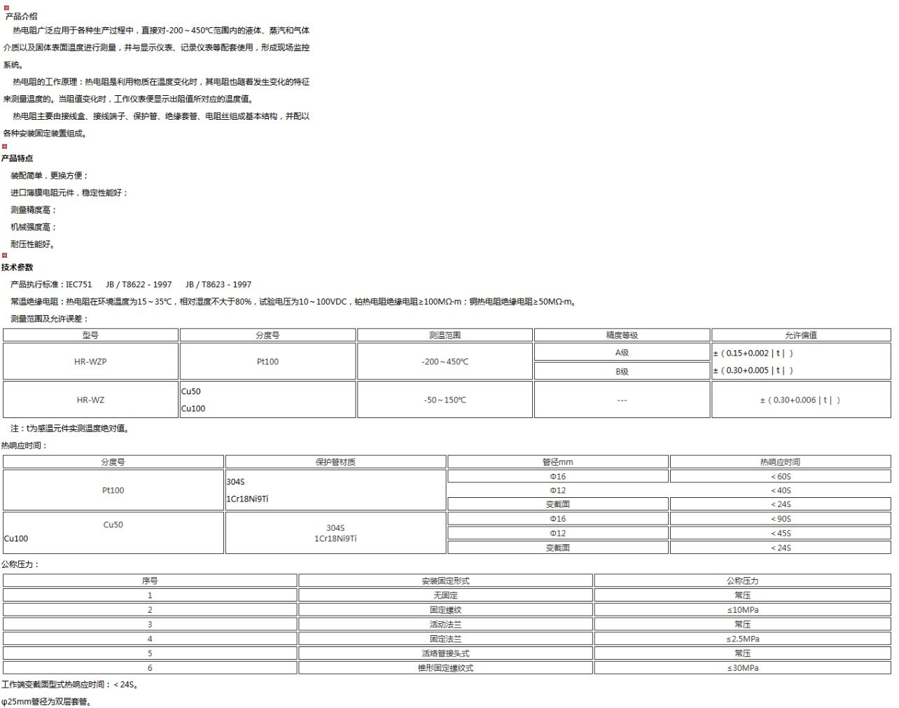 熱電阻(thermal resistor)是中低溫區(qū)最常用的一種溫度檢測器。熱電阻測溫是基于金屬導體的電阻值隨溫度的增加而增加這一特性來進行溫度測量的。它的主要特點是測量精度高,性能穩(wěn)定。其中鉑熱電阻的測量精確度是最高的,它不僅廣泛應(yīng)用于工業(yè)測溫,而且被制成標準的基準儀。