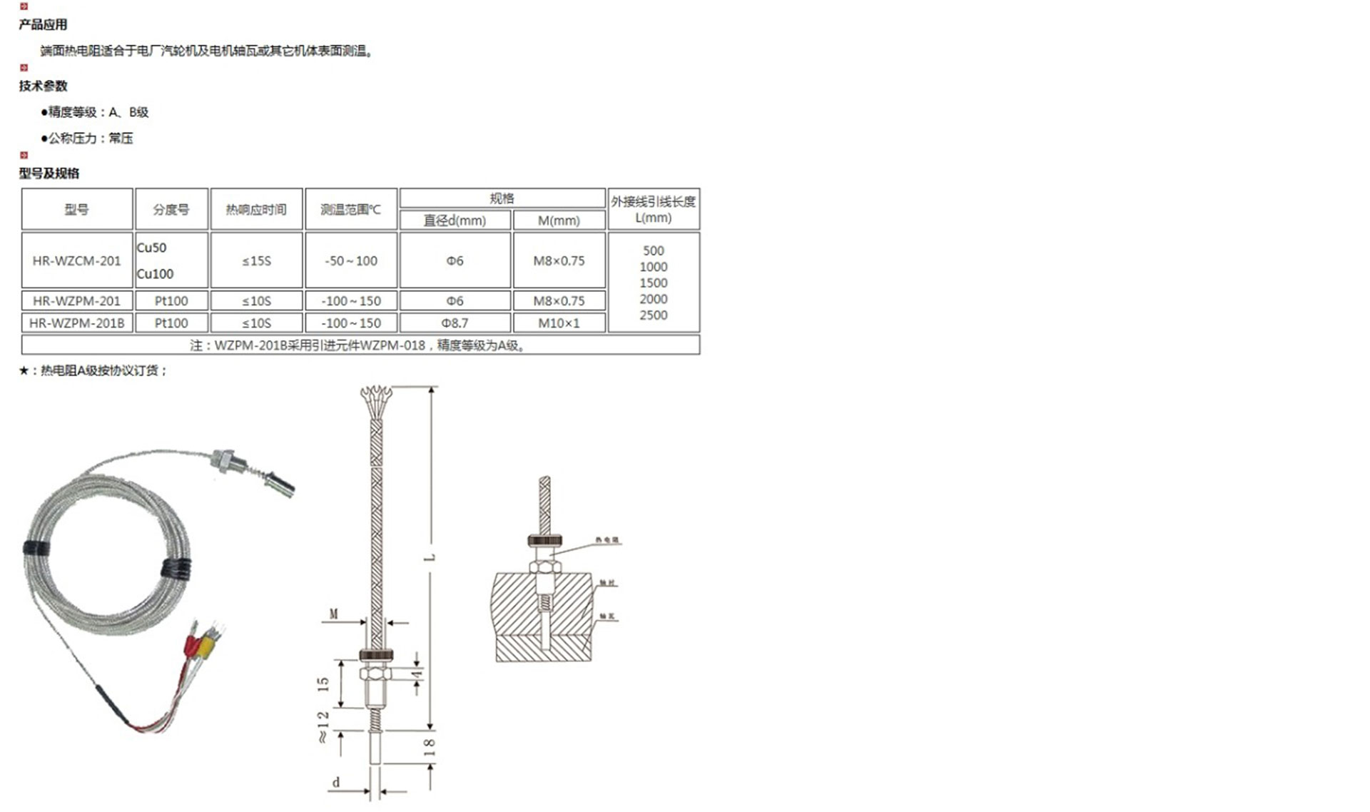 端面熱電阻元件由特殊處理的絲材(銅或鉑絲)繞制,它們緊巾在溫度計前端,與一般軸向熱電阻相比,端面熱電阻能更正確和迅速地反映被測端面的實際溫度狀況,它的制作方法很多,品種形式多樣,適合于電廠汽輪機及電機軸瓦或其它機體表面測溫。