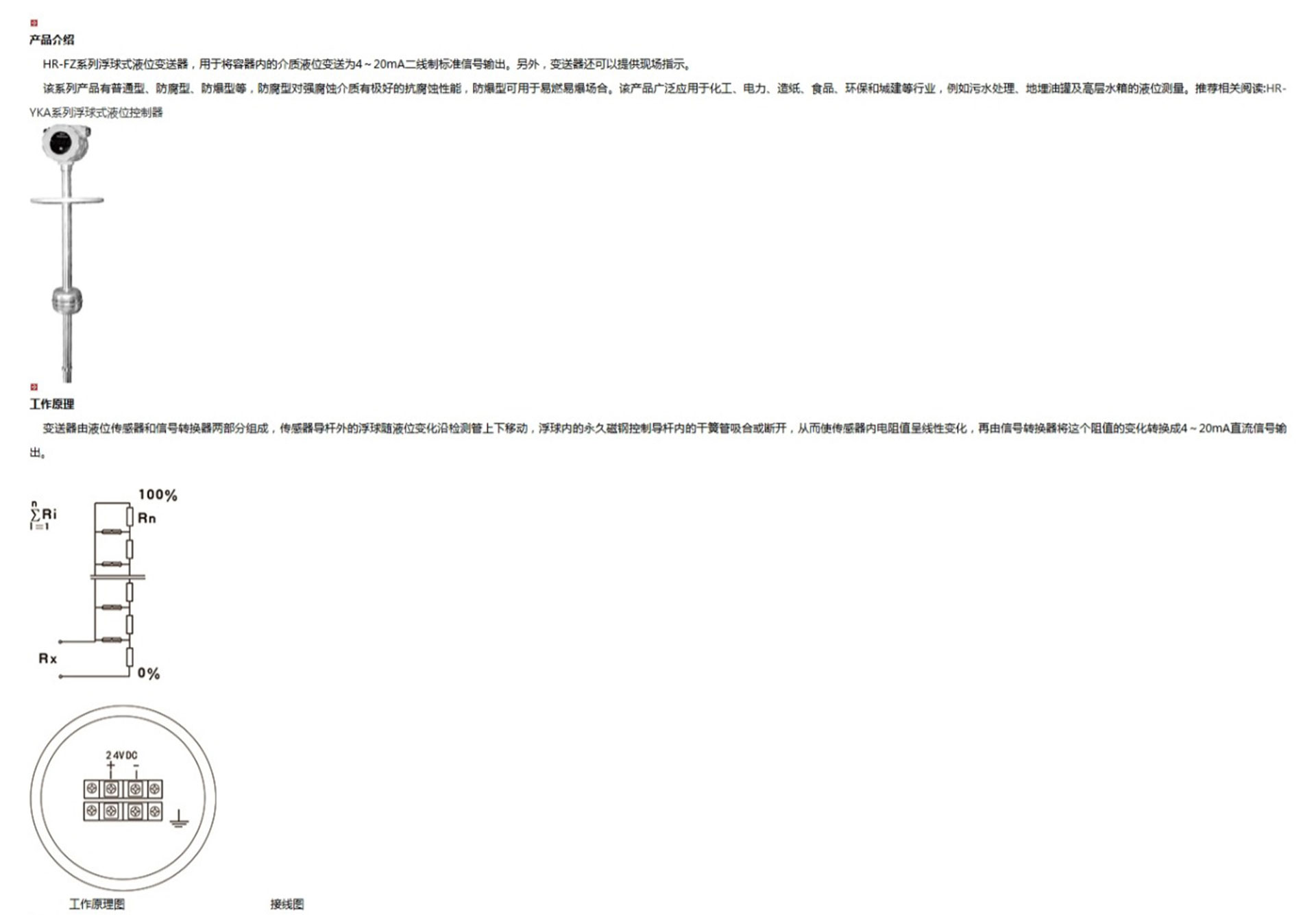 HR-FZ系列浮球式液位變送器,用于將容器內(nèi)的介質(zhì)液位變送為4~20mA二線制標(biāo)準(zhǔn)信號(hào)輸出。另外,變送器還可以提供現(xiàn)場指示。